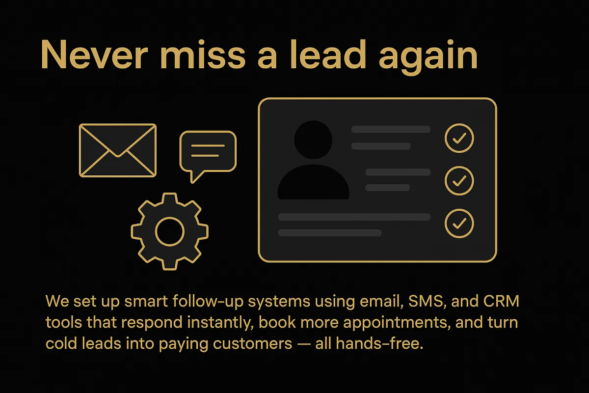 We set up smart follow-up systems using email, SMS, and CRM tools that respond instantly, book more appointments, and turn cold leads into paying customers — all hands-free.